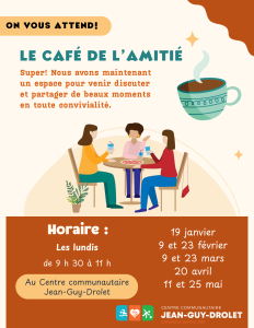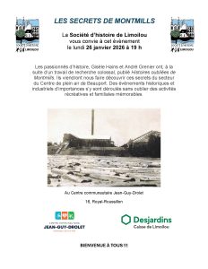 La conférence de M. Réjean Lemoine, Joies et Peines à Québec est reportée au lundi 27 avril prochain. Elle est remplacée par la présentation des Secrets de Montmills avec Mme Gisèle Hains et M. André Grenier, toujours le lundi 26 janvier.